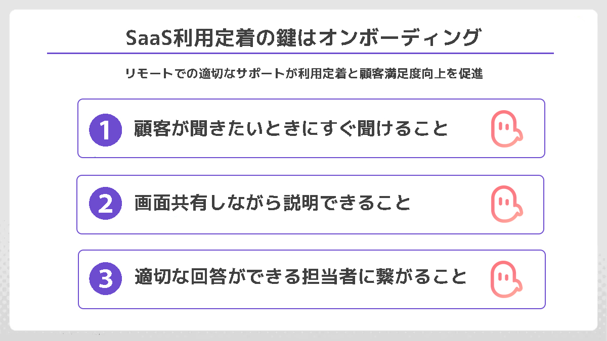 SaaSは操作や設定が複雑な場合が多く、電話やメールだけでは十分な説明が難しいことがあります。さらに、課題ごとにオンラインミーティングを設定するのも効率的ではありません。